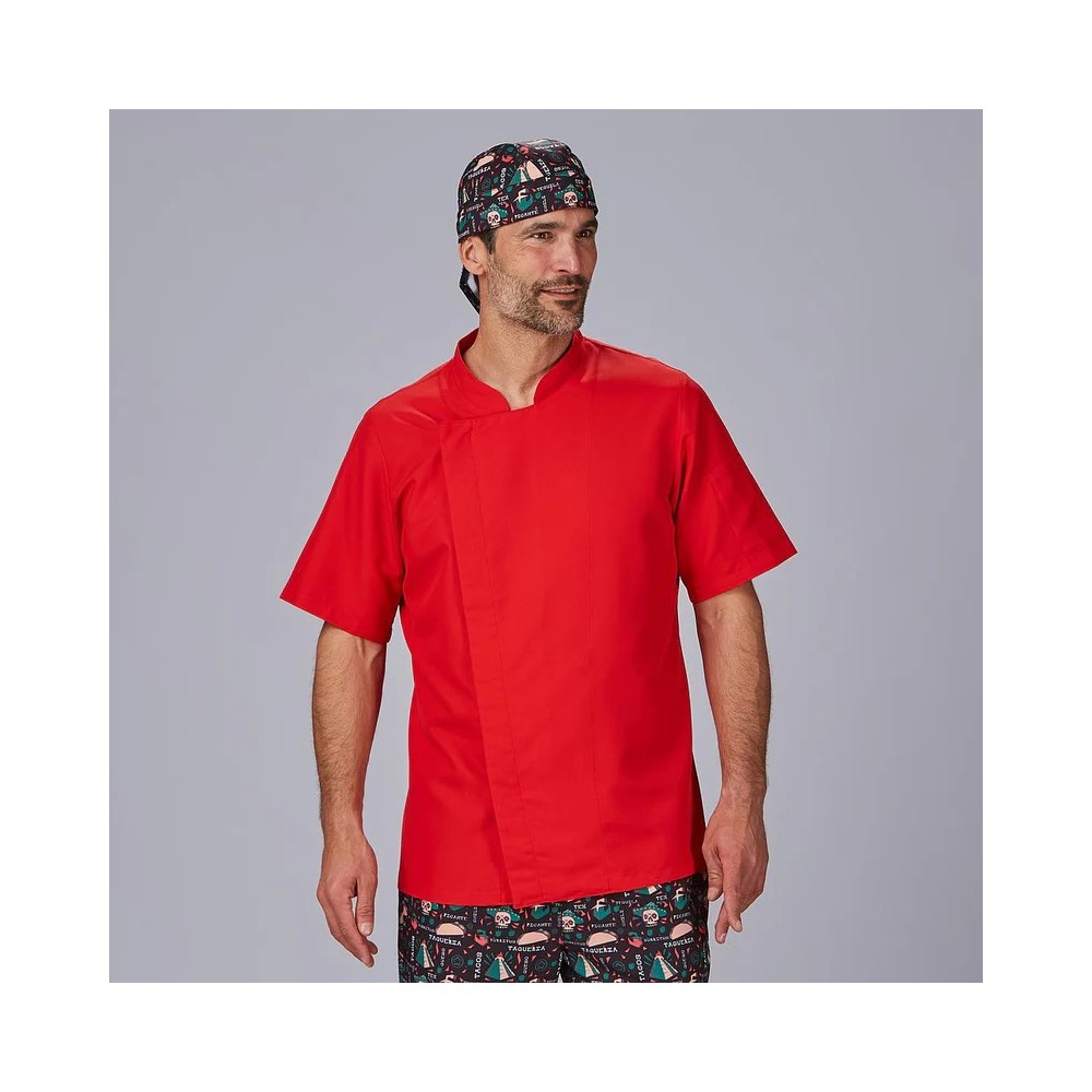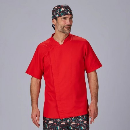 Giacca da cucina dal design elegante con maniche corte, collo alla coreana e chiusura incrociata con bottoni a pressione nascosti.