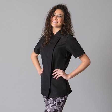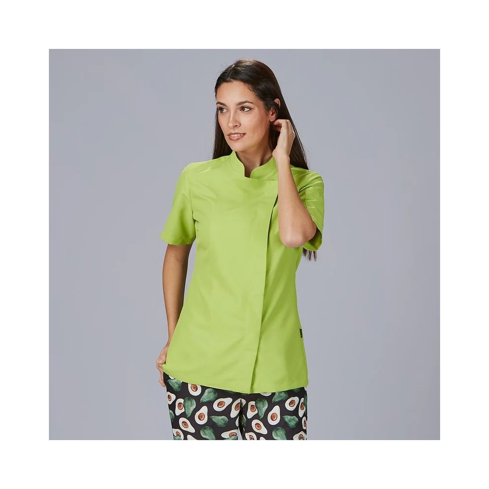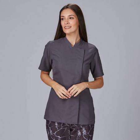 Giacca da cucina dal design elegante con maniche corte, collo alla coreana e chiusura incrociata con bottoni a pressione nascosti.