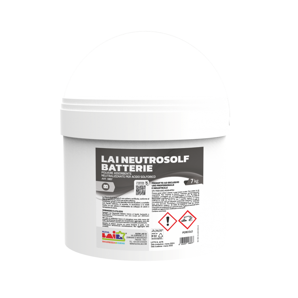 Polvere assorbente neutralizzante certficata per acido solforico fuoriuscito da batterie e accumulatori vari.