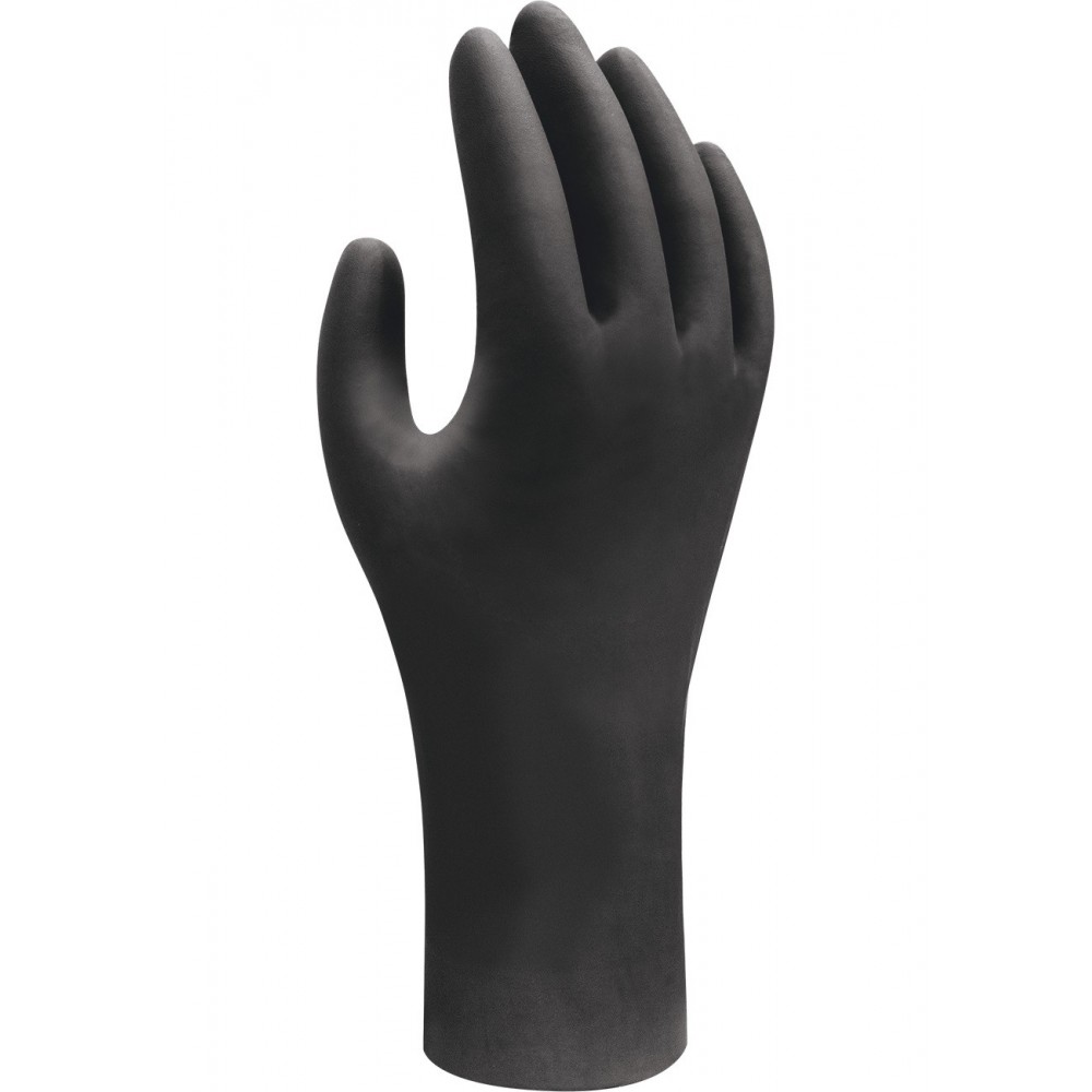 Guanto monouso 100% nitrile, colore nero, senza polvere, senza plastificanti e senza silicone.