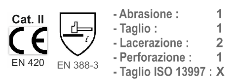 Il guanto NIBER 160 soddisfa i requisiti delle norme tecniche armonizzate EN 420-2003+A1:2009 ed EN 388-2003 e direttiva 2002/61/CE e ha superato i test AZO DYES e PH VALUE, che sono test legati alla salubrità dei DPI, richiesti dalla norma EN 420.